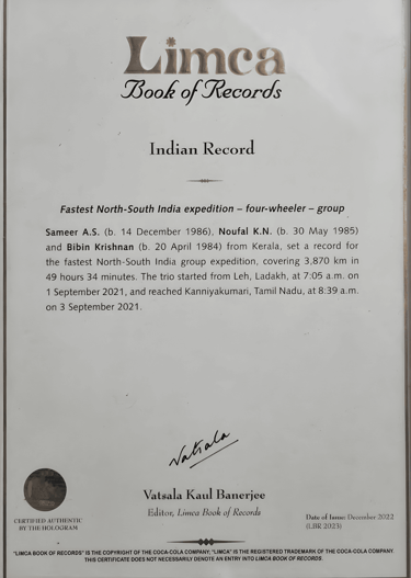 National Record Holder: Fastest Drive from Ladakh to Kanyakumari by Car (2021).