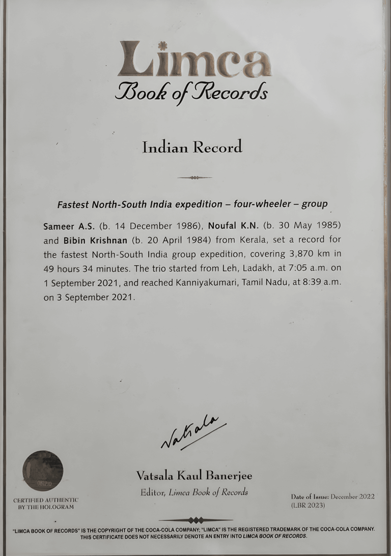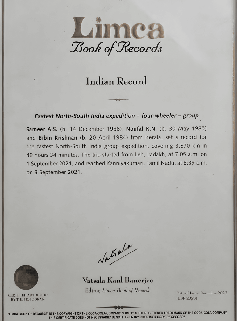 National Record Holder: Fastest Drive from Ladakh to Kanyakumari by Car (2021).